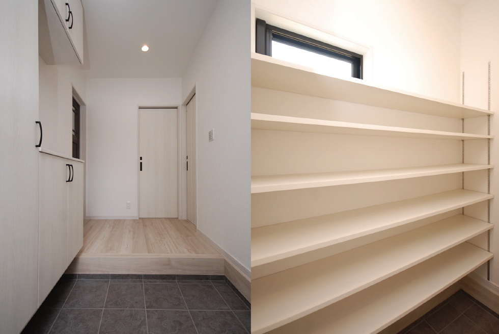 ツートンカラーを基調とした玄関には自然光が差し込む大型シューズクロークをレイアウト