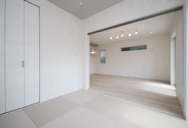 3枚引戸が全て収納でき、リビングと開放的に繋がる琉球畳の和空間。