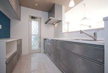 木目調の折下げ天井に石目調のカラーが調和するキッチン。