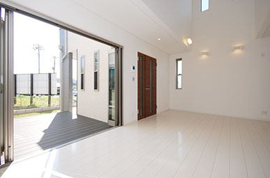 フルオープンサッシでアウトドアリビングとなる中庭へ続くリビング