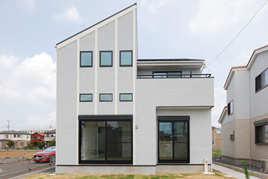 急勾配の片流れの屋根と切妻屋根を組み合わせたクールモダンの外観デザイン