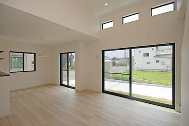 ワイドサッシとハイサイドライト(高窓)からの陽光で満たされるリビングルーム