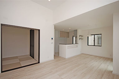 天井の高低差を付け実際より広さを感じるリビングには寛ぎの和空間を演出