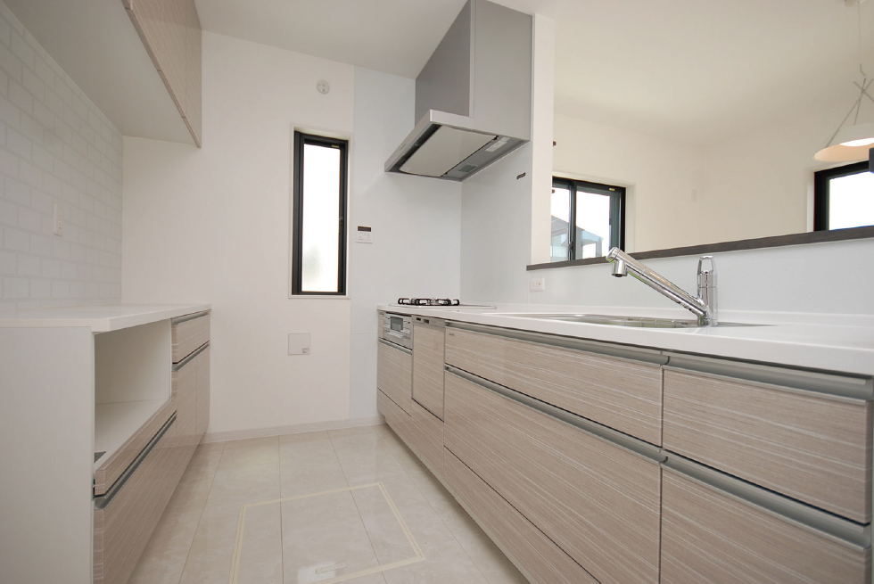 対面タイプのキッチンの背面にはワイドカウンター付きの大型収納