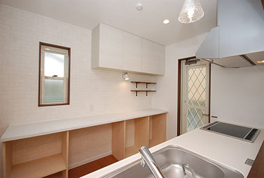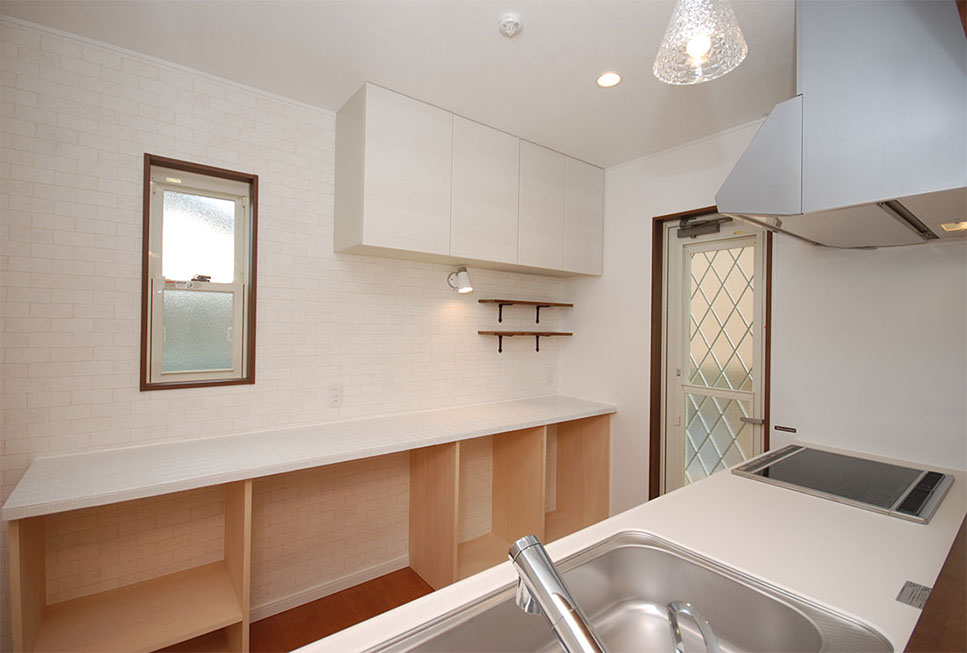 背面の造作カウンターはタイル貼りで既製品にはない温もり