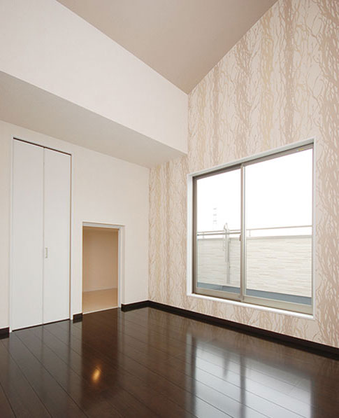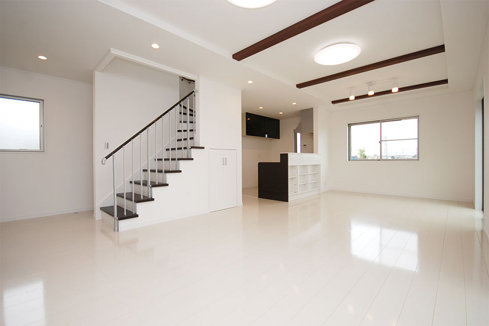 シンプルな空間の中にも、おりあげ天井と化粧梁が立体デザインを演出