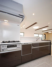 さりげなく化粧梁とカラーを合わせたキッチン