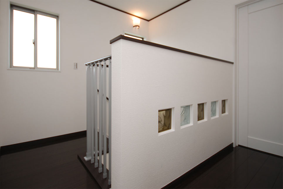 2階ホールにもツートンカラーのガラスブロックでアクセント