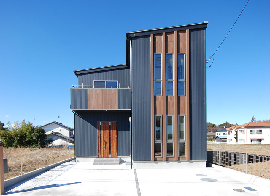 縦スリッドの外観に縦型の窓と木目調の化粧柱とサイディングをアクセントに