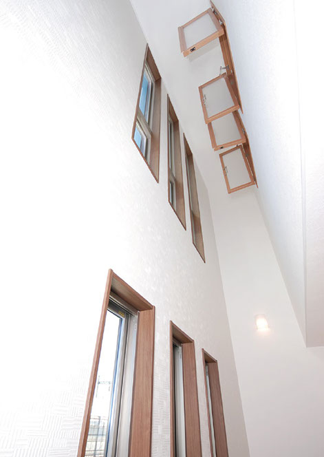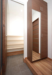 自然光を取り入れた大容量のシューズクロークのある玄関ホール