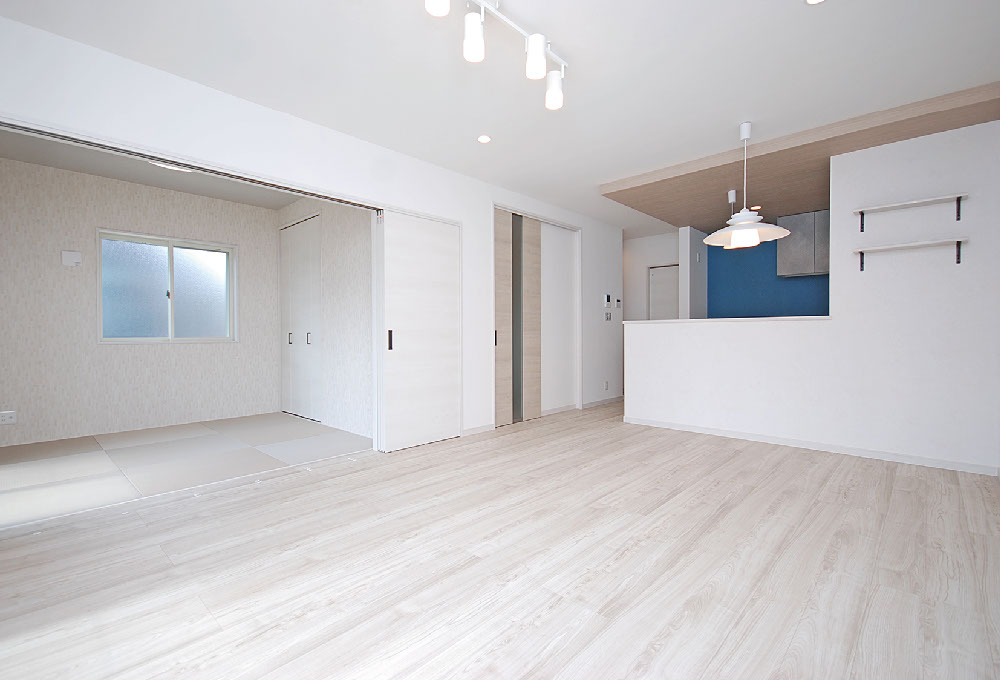 3枚引戸が全て収納でき、リビングと開放的に繋がる琉球畳の和空間。