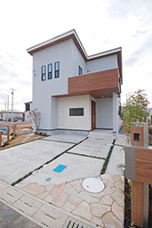 割石と土間を組み合わせた外構と調和するモノトーンカラーに温もりのWoody素材を配色した外観。