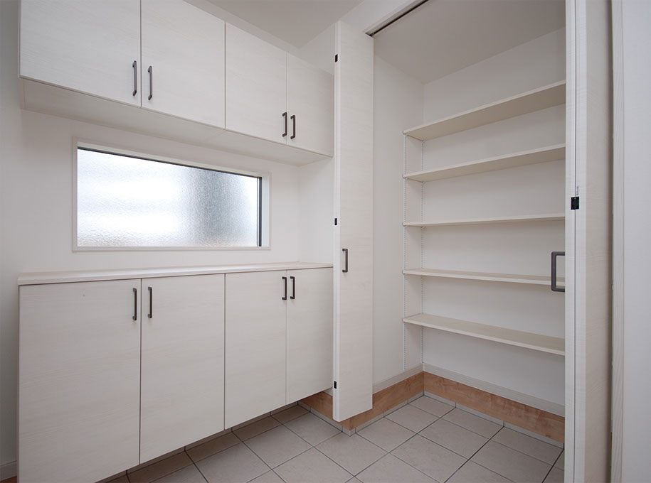 大型下駄箱+シューズクロークをレイアウトした広々玄関ホール。