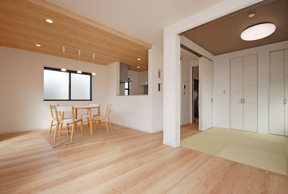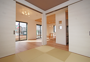 リビングからの段差を設けずフラットに繋がる寛ぎの「和」空間。