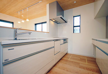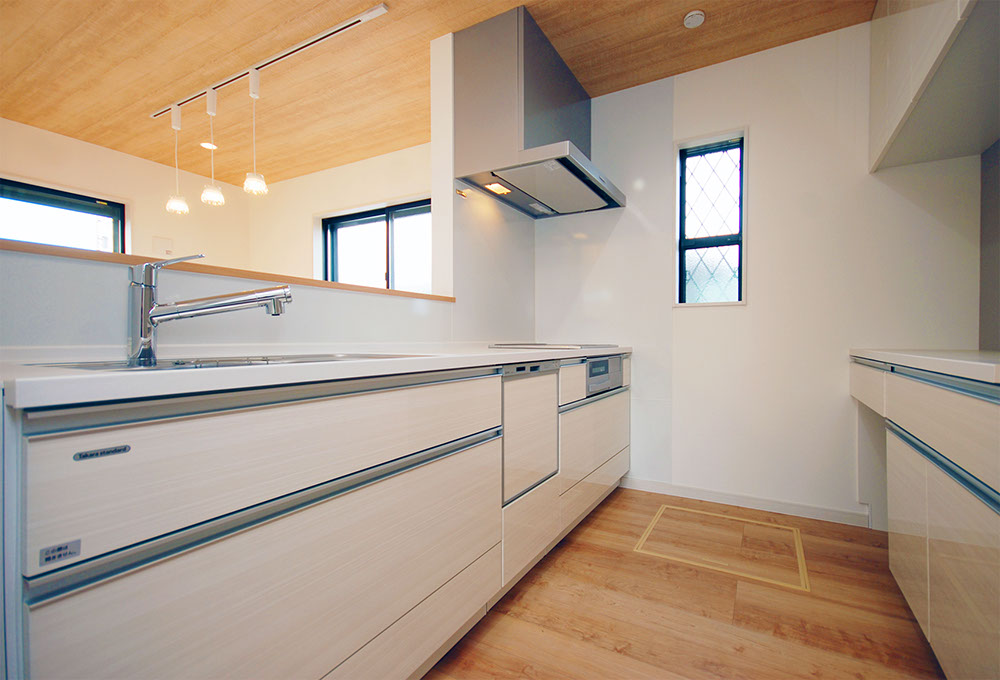 キッチンエリアを折り下げ天井にすることで木目の質感を活かしたナチュラル空間を演出。