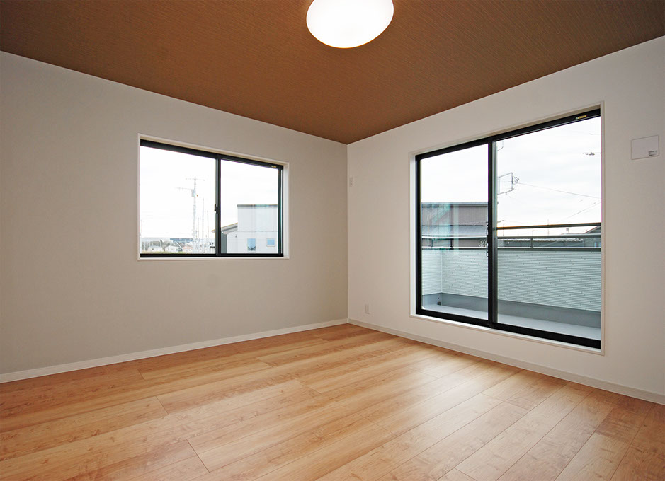 天井と壁に、和テイストのモダンカラーをセレクトした趣ある主寝室。