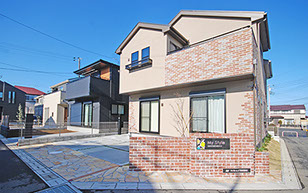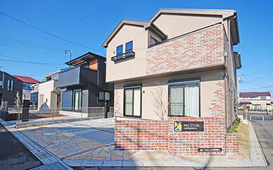 自然石貼りインターロッキングのアプローチとレンガ調タイルが優しい表情を演出。