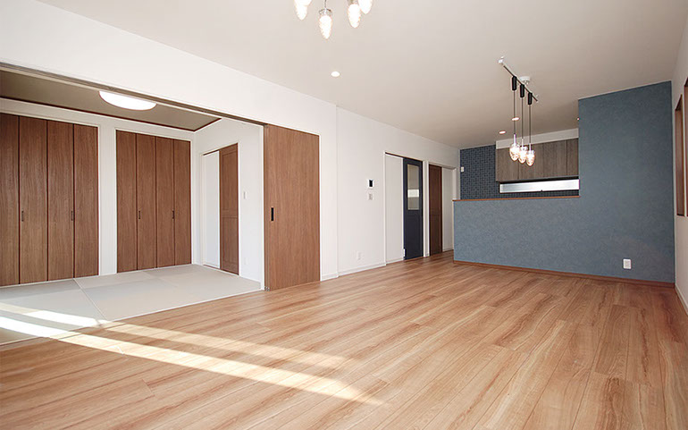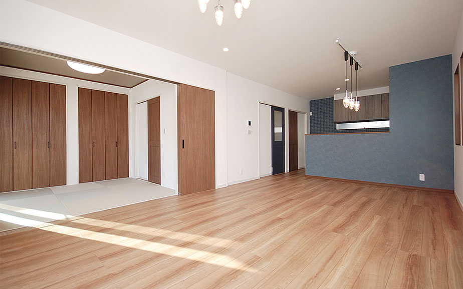 ナチュラルカラーにダークブルーのアクセントがモダンなリビングを演出。