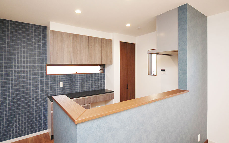 キッチンの背面壁にダークブルーのタイルがアクセントに。