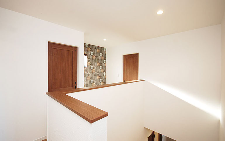 開放的で明るい2階ホールはアクセントウォールがモダンなエッセンスに。