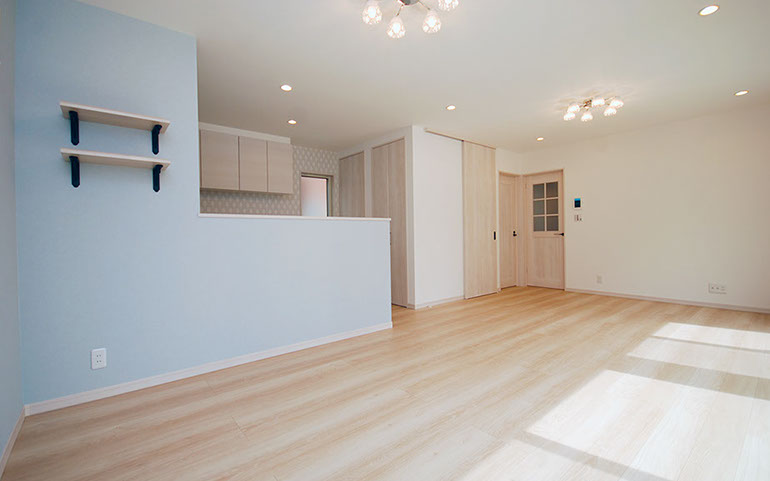 ホワイドウッド基調の空間に優しい空色がアクセントになっているリビング。
