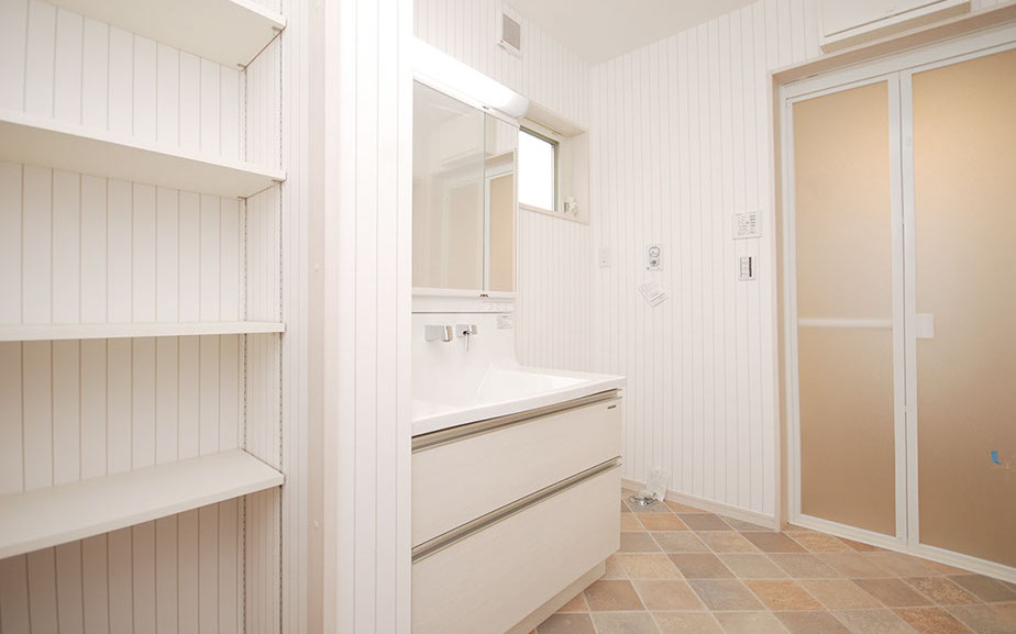 ゆとりあるパウダーリームには可変棚のあるリネン収納。