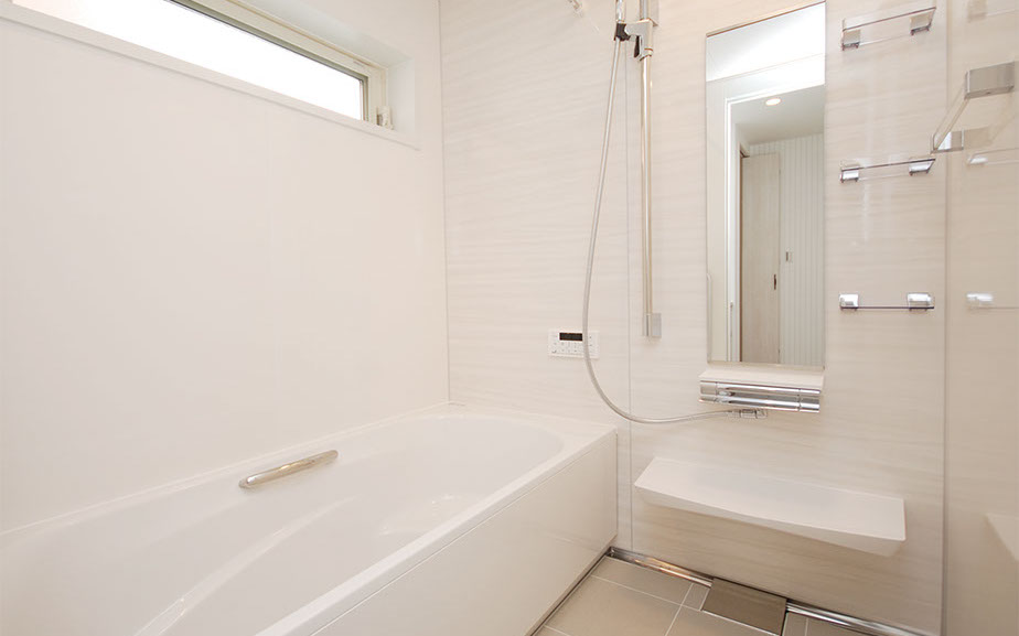 ハイサイド窓からの採光で明るさを確保したバスルーム。