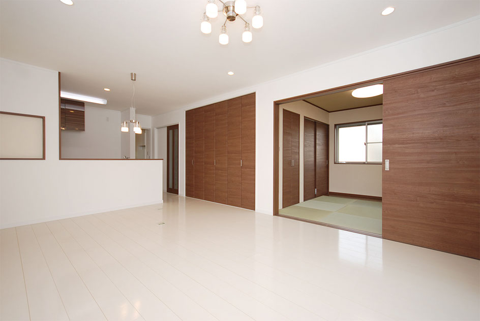 幅広オフホワイトのフローリングが陽光を空間全体に優しく広がる明るいリビング