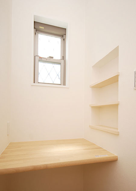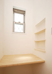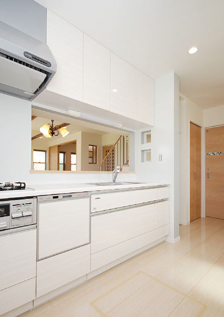 清潔感ある白を基調としたキッチンにアクセントとなる小窓。