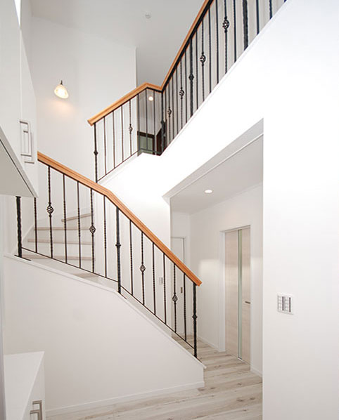 ダイナミックな吹抜にアイアン製の手摺が重厚なエッセンス