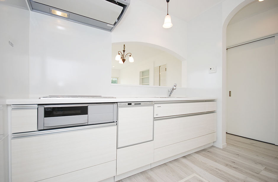 キッチン開口部は上部をアーチ形とし、空間を優しく繋げます